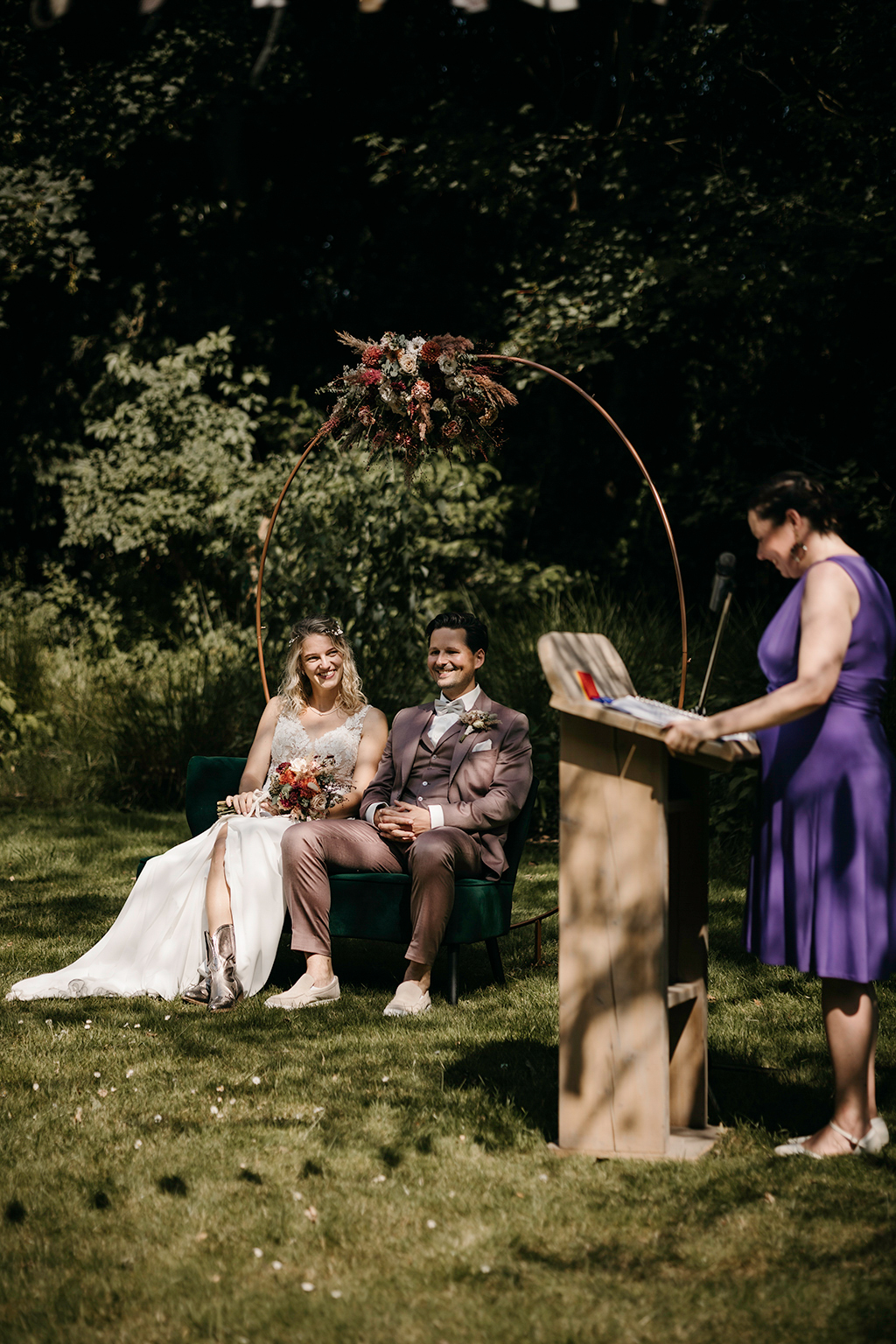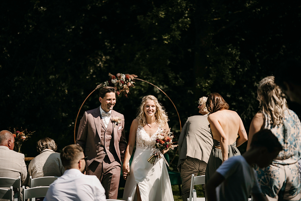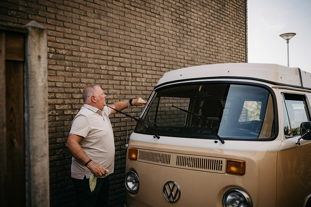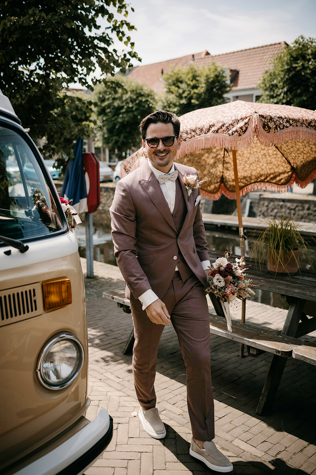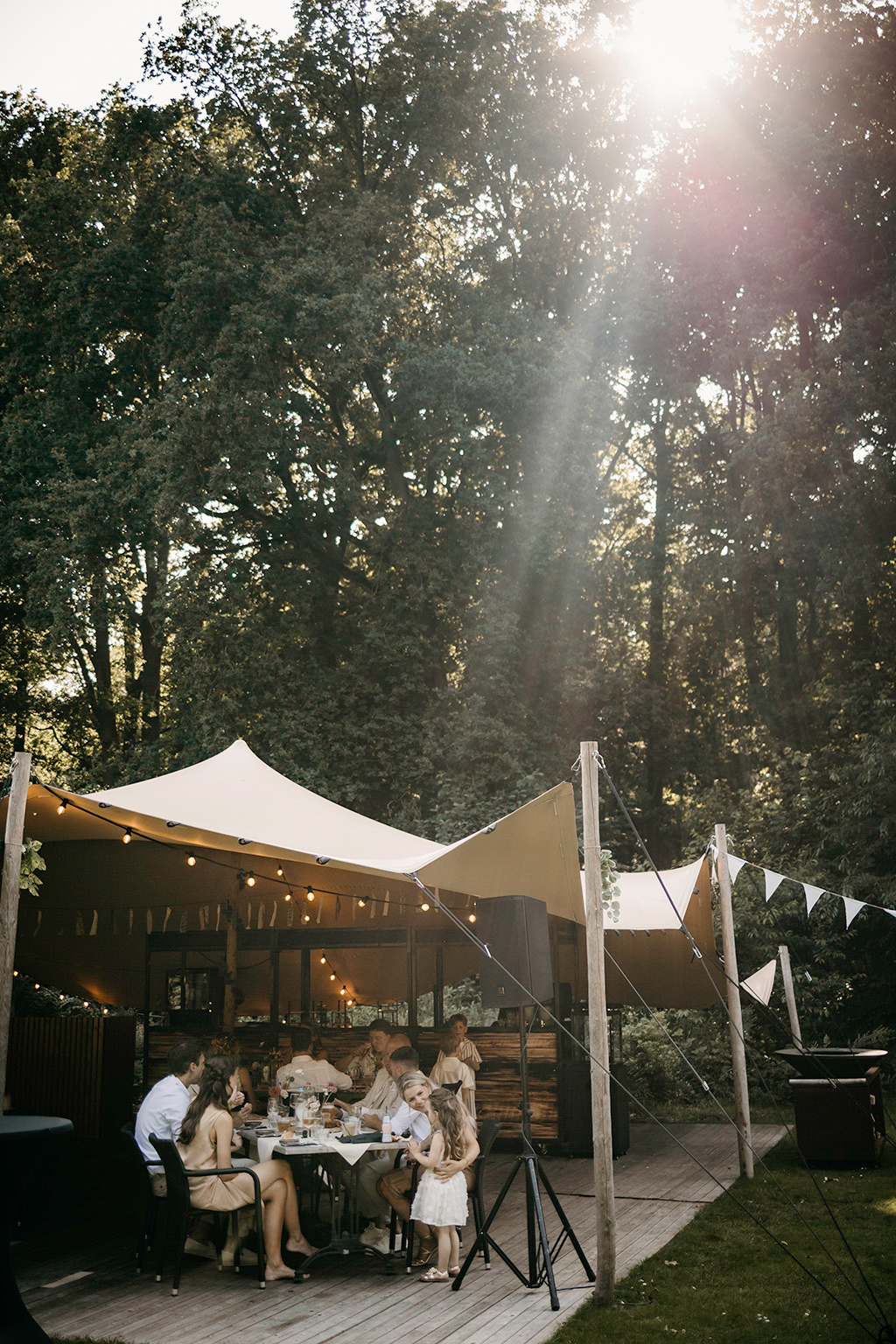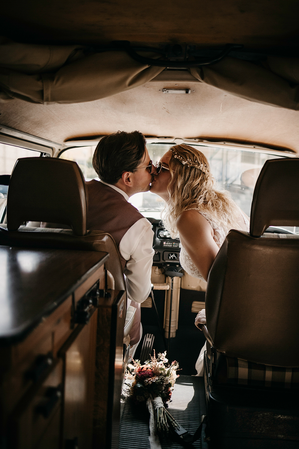 Hasselt was het decor voor de de start van hun dag: first look aan de gracht en foto’s maken op de plekken waar het allemaal ooit begon. Daarna in het camperbusje richting het bos en de trouwlocatie. Het was heet, maar wie zei dat een beetje zon de liefde kan verpesten? Het was een dag die precies bij hen past: relaxed, vrolijk en vol kleine avonturen.